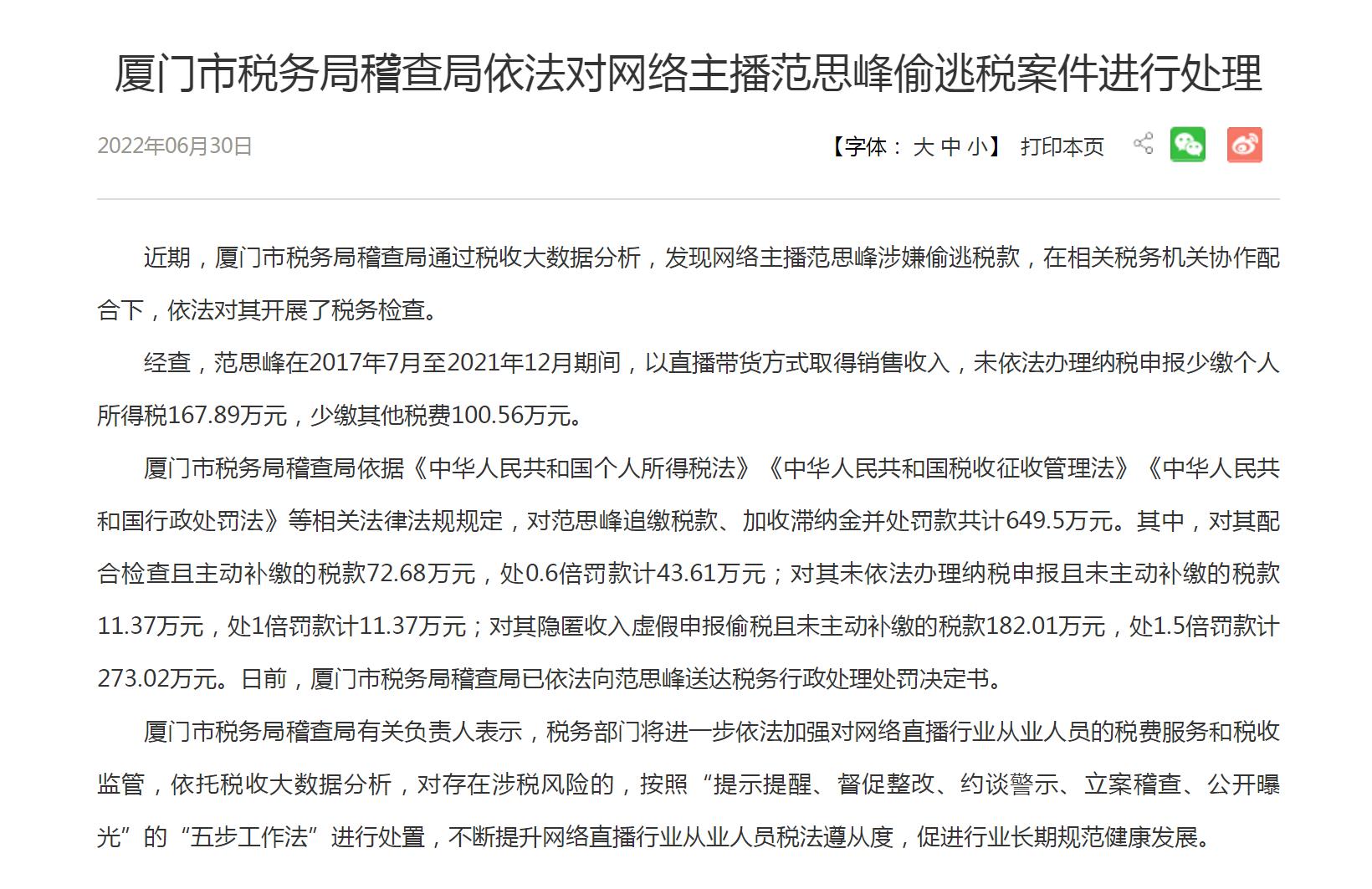 中新经纬6月30日电 据国家税务总局网站30日消息,近期,厦门市税务局稽查局通过税收大数据分析,发现网络主播范思峰涉嫌偷逃税款,在相关税务机关协作配合下,依法对其开展了税务检查。