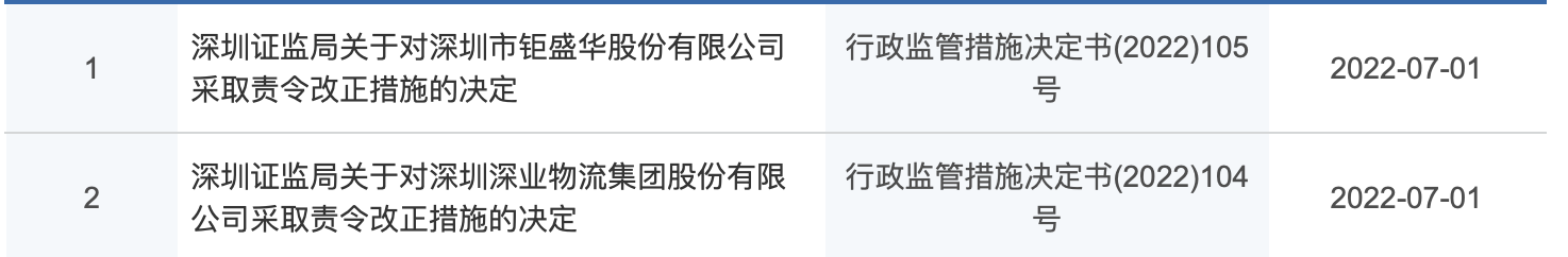 7月1日,深圳证监局披露了两份行政监管措施,因深圳市钜盛华股份有限公司(下称钜盛华公司)和深圳深业物流集团股份有限公司(下称深业物流公司)作为公司债券发行人,未按规定及时披露2021年年度报告,深圳证监局决定对上述两家公司采取责令改正的监管措施。