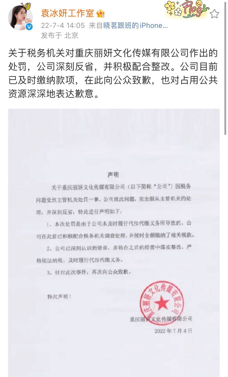 袁冰妍工作室发声明进行回应,称关于税务机关对重庆丽妍文化传媒有限公司作出的处罚,公司深刻反省,并积极配合整改,公司目前已及时缴纳款项,在此向公众致歉,也对占用公共资源深深地表达歉意。