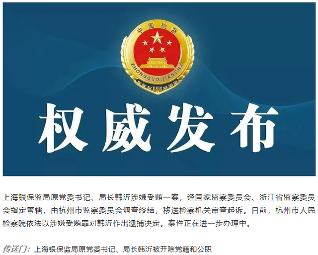 上海银保监局原党委书记、局长韩沂涉嫌受贿一案,经国家监察委员会、浙江省监察委员会指定管辖,由杭州市监察委员会调查终结,移送检察机关审查起诉。日前,杭州市人民检察院依法以涉嫌受贿罪对韩沂作出逮捕决定。案件正在进一步办理中。