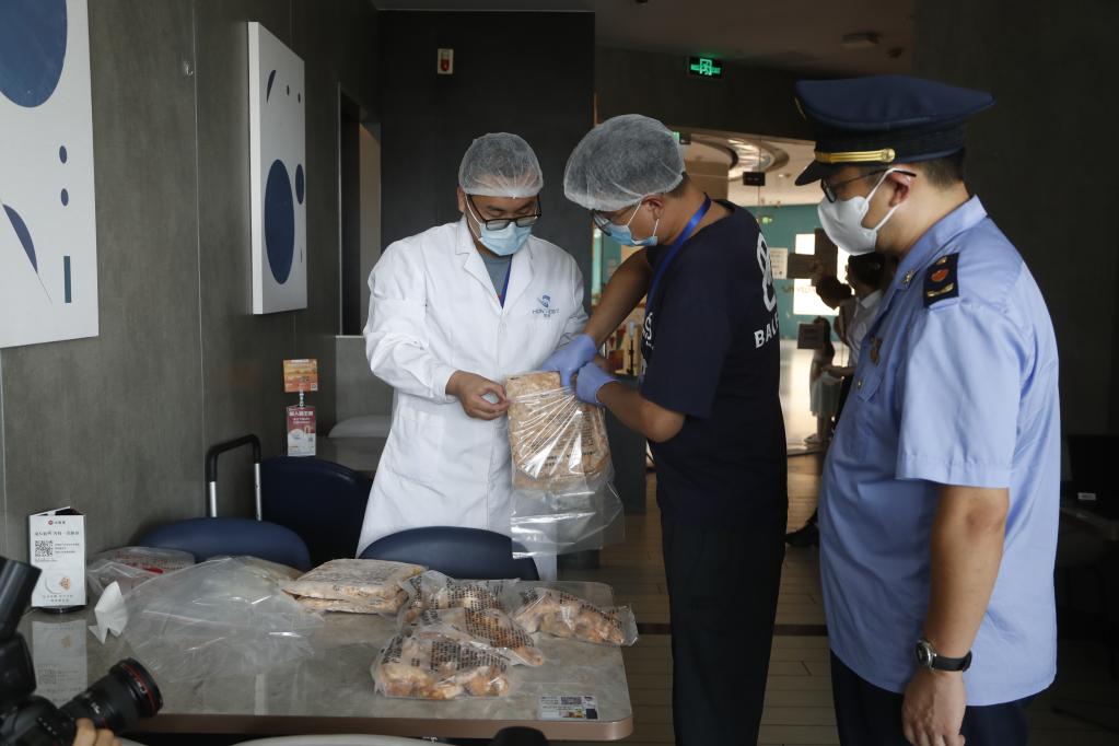 北京市海淀区市场监管局执法人员正在对涉事门店食品原材料进行检查