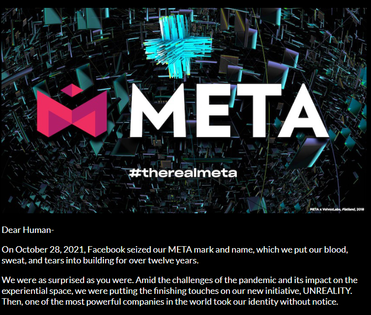 同时,小Meta的CEO还发表博客文章控诉道:“2021年10月28日,Facebook获得了我们的META标志和名称,这是我们十二年来用自己的血、汗和眼泪建立起来的。我们和你们一样惊讶……世界上最强大的公司之一在未告知的情况下夺走了我们的身份。”