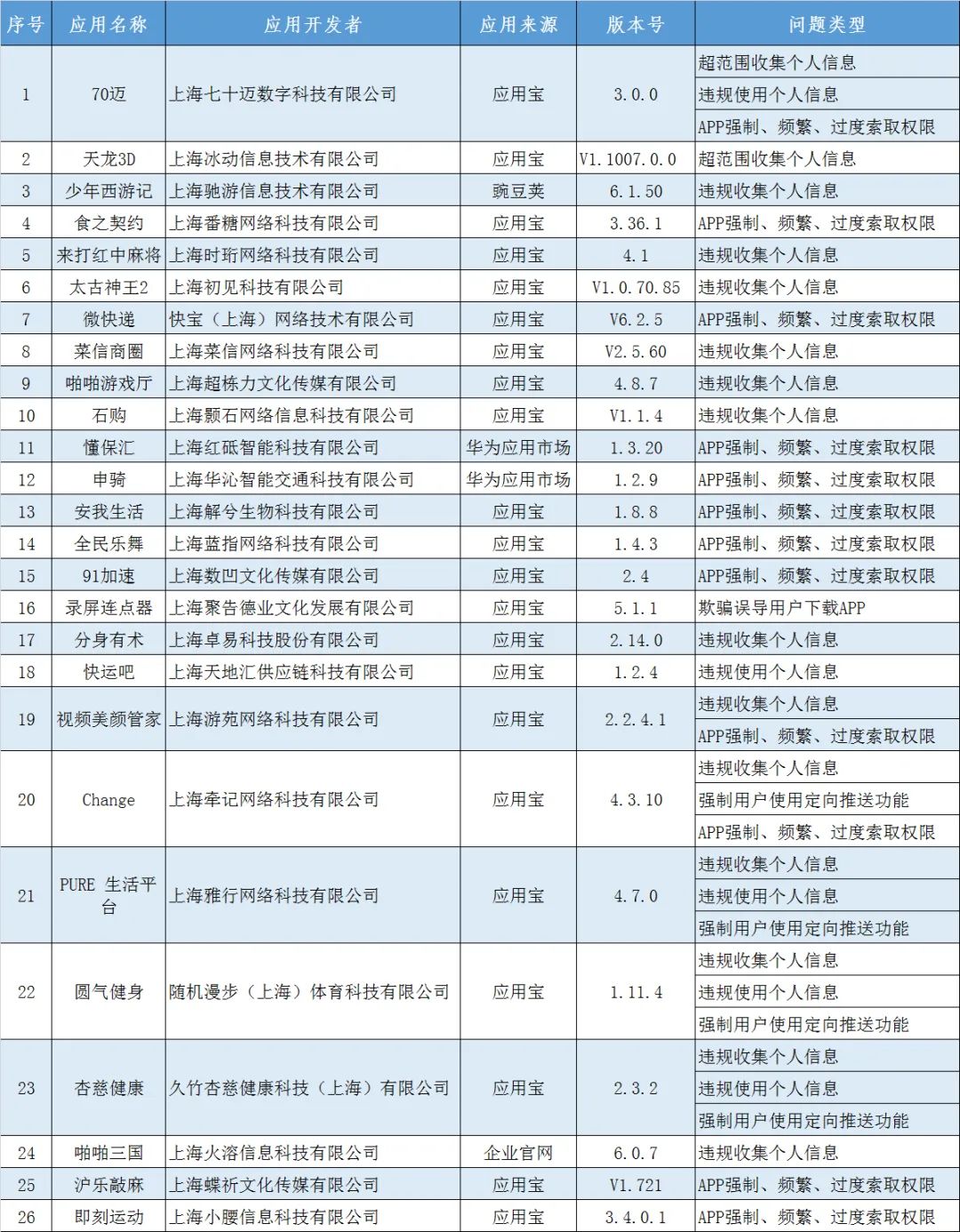 上海市通信管理局微信公众号“上海通信圈”26日消息,该市有26款APP侵害用户权益且逾期不整改,涉及食之契约、微快递、天龙3D等。