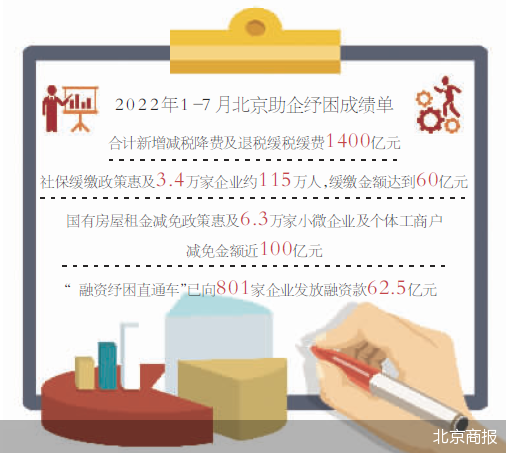 “截至8月1日,北京今年合计新增减税降费及退税缓税缓费1400亿元;社保缓缴政策惠及3.4万家企业约115万人,缓缴金额达到60亿元;国有房屋租金减免政策惠及6.3万家小微企业及个体工商户,减免金额近100亿元;“融资纾困直通车”已向801家企业发放融资款62.5亿元。”戴颖介绍道。