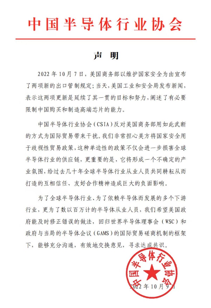 在声明中,中国半导体行业协会指出,10月7日,美国工业和安全局发布新闻,表示这两项出口管制规定更新是延续了其一贯的目标和努力,阐述了有必要限制中国购买和制造高端芯片的能力。
