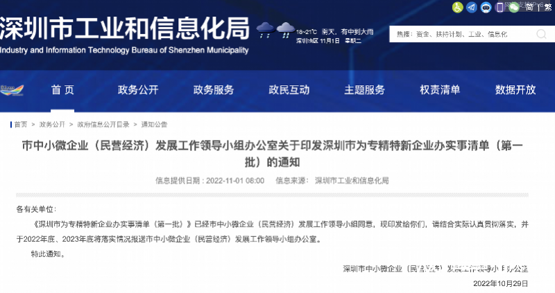 11月1日是“深圳企业家日”。这一天,深圳也为专精特新企业送上了一份专属“大礼包”。深圳市中小微企业(民营经济)发展工作领导小组办公室发布了《关于印发深圳市为专精特新企业办实事清单(第一批)的通知》(以下简称《通知》)。《通知》表示,为专精特新企业办实事清单旨在加强深圳市专精特新企业(含专精特新“小巨人”企业和专精特新中小企业)培育工作,支持专精特新企业高质量发展,引导更多中小企业走专精特新发展之路。