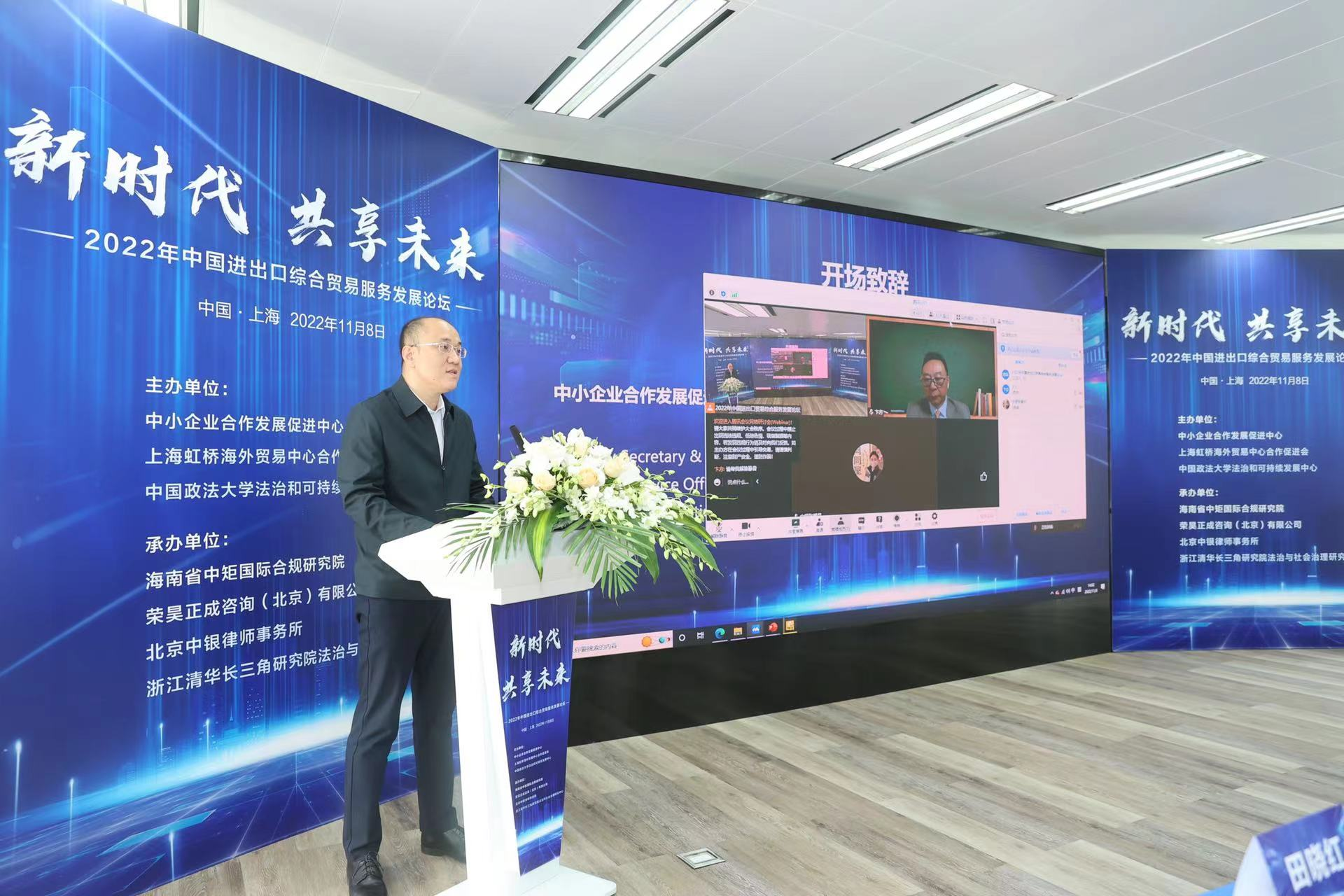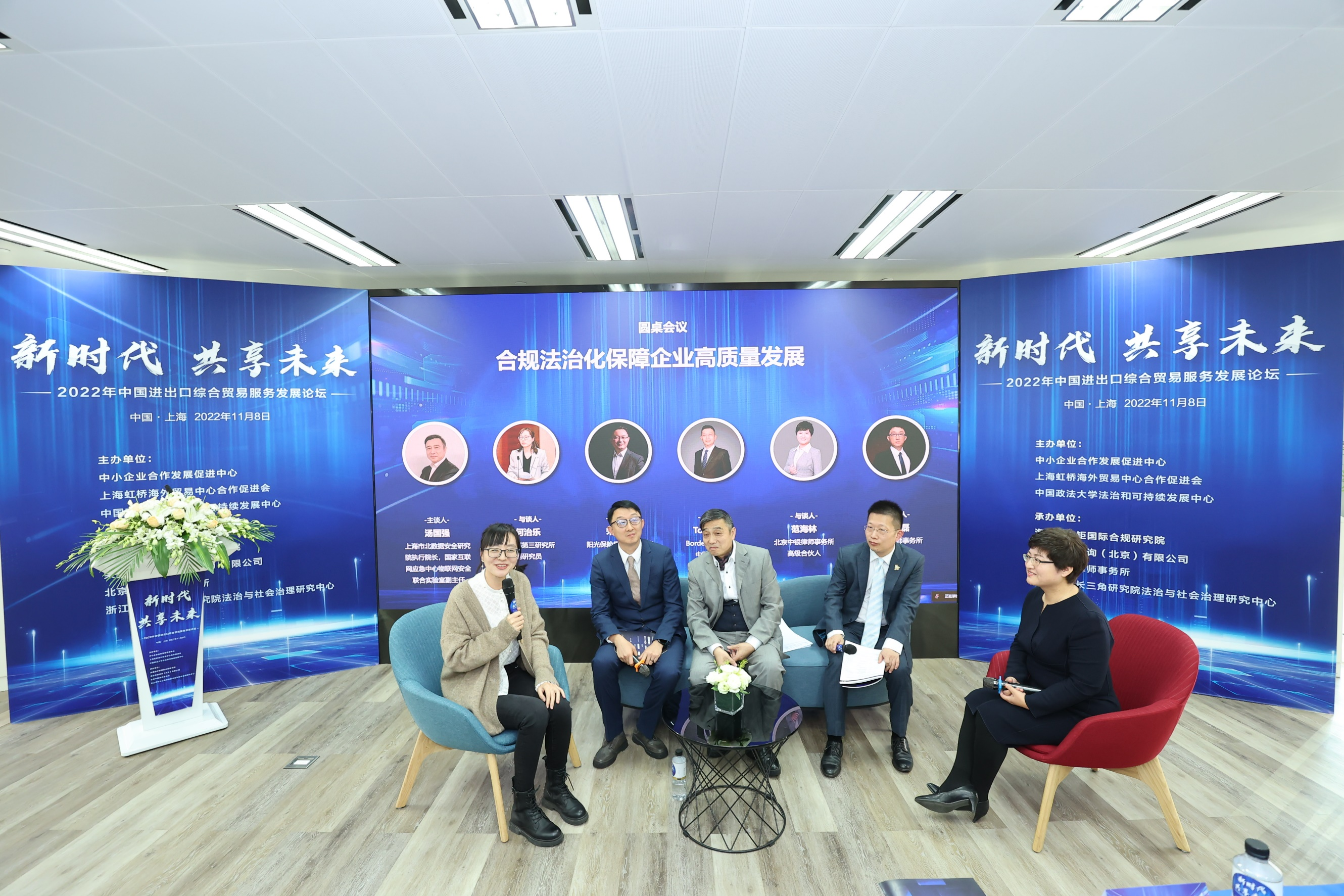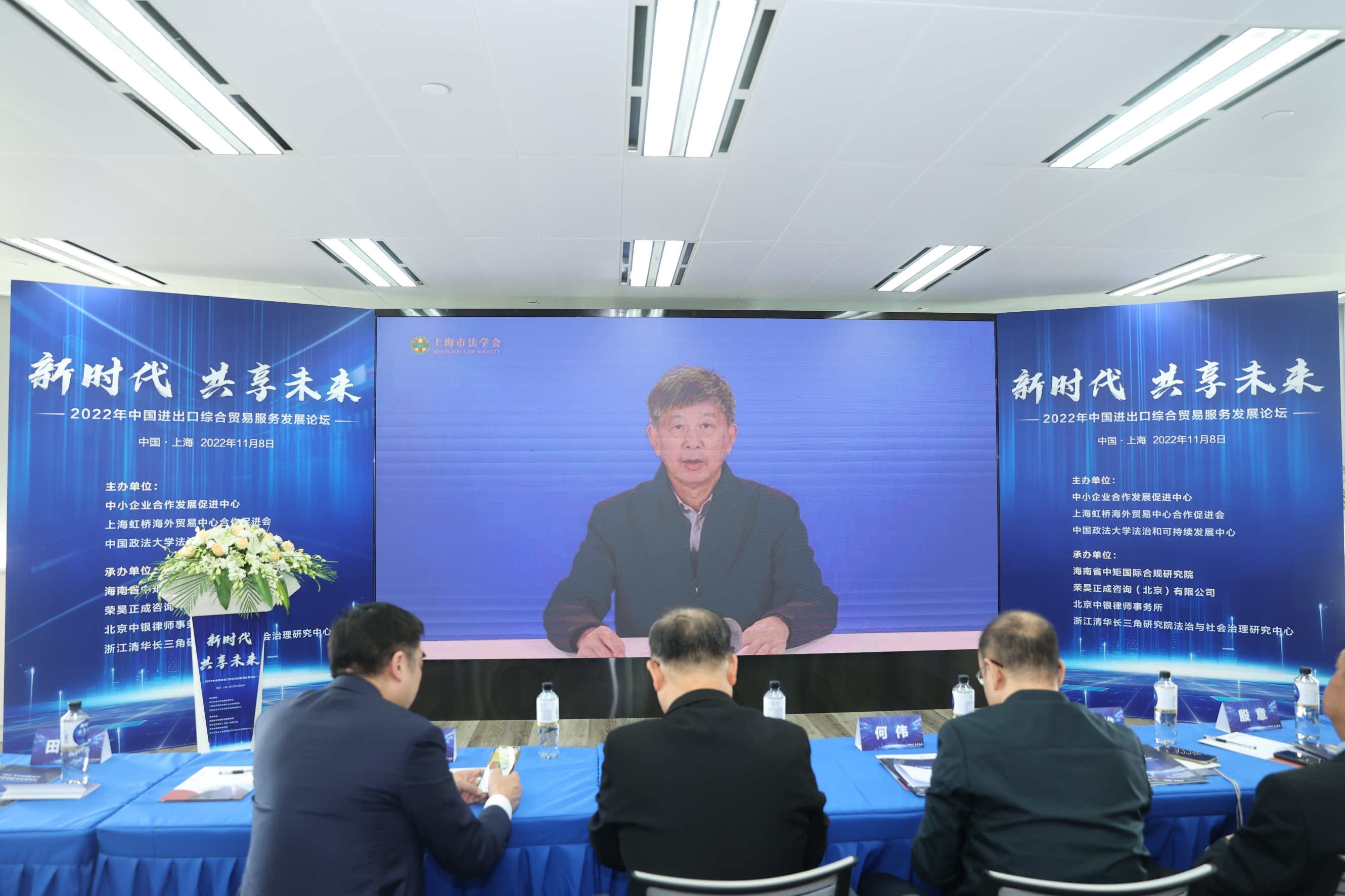 2022年11月8日,由中小企业合作发展促进中心、上海虹桥海外贸易中心合作促进会、中国政法大学法治与可持续发展中心共同主办的“2022年中国进出口综合贸易服务发展论坛”在上海虹桥海外贸易中心隆重举行,政府领导、专家学者、企业代表共同探讨综合贸易服务变化及贸易合规挑战。