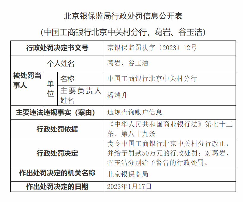 1月28日,北京银保监局行政处罚信息公开表显示,中国工商银行北京中关村分行主要违法违规事实为,违规查询账户信息。2023年1月17日,北京银保监局责令中国工商银行北京中关村分行改正,并给予罚款50万元的行政处罚;对葛岩、谷玉洁分别给予警告的行政处罚。