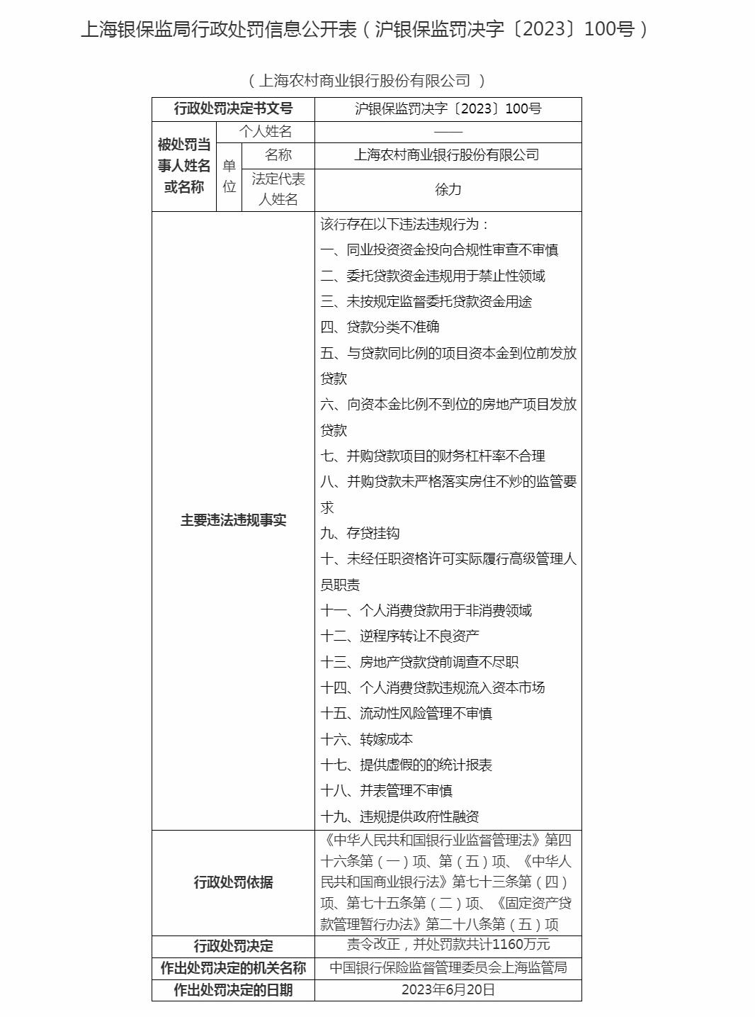 对此,上海银保监局依据《中华人民共和国银行业监督管理法》第四十六条第(一)项、第(五)项、《中华人民共和国商业银行法》第七十三条第(四)项、第七十五条第(二)项、《固定资产贷款管理暂行办法》第二十八条第(五)项的规定,对上海农商银行作出责令改正,并处罚款共计1160万元。作出行政处罚决定日期为2023年6月20日。