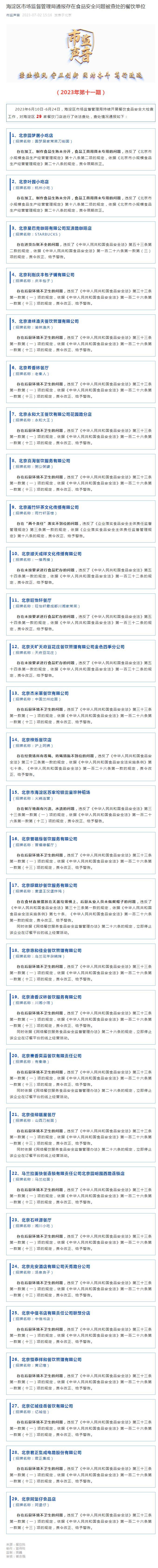 7月2日,北京市海淀区市场监督管理局在其公众号通报存在食品安全问题被查处的餐饮单位。6月10日-6月24日,海淀区市场监督管理局持续开展餐饮食品安全大检查工作,对海淀区29家餐饮门店进行了依法查处。