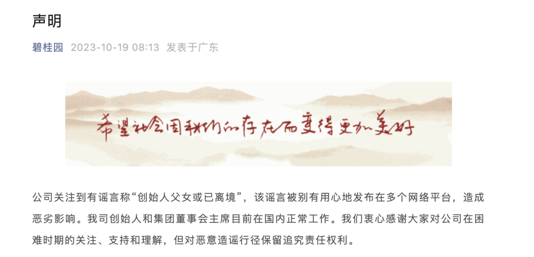 10月19日早间,碧桂园官微发布声明,对“创始人父女或已离境”等谣言进行辟谣。碧桂园表示,该谣言被别有用心地发布在多个网络平台,造成恶劣影响。我司创始人和集团董事会主席目前在国内正常工作。我们衷心感谢大家对公司在困难时期的关注、支持和理解,但对恶意造谣行径保留追究责任权利。