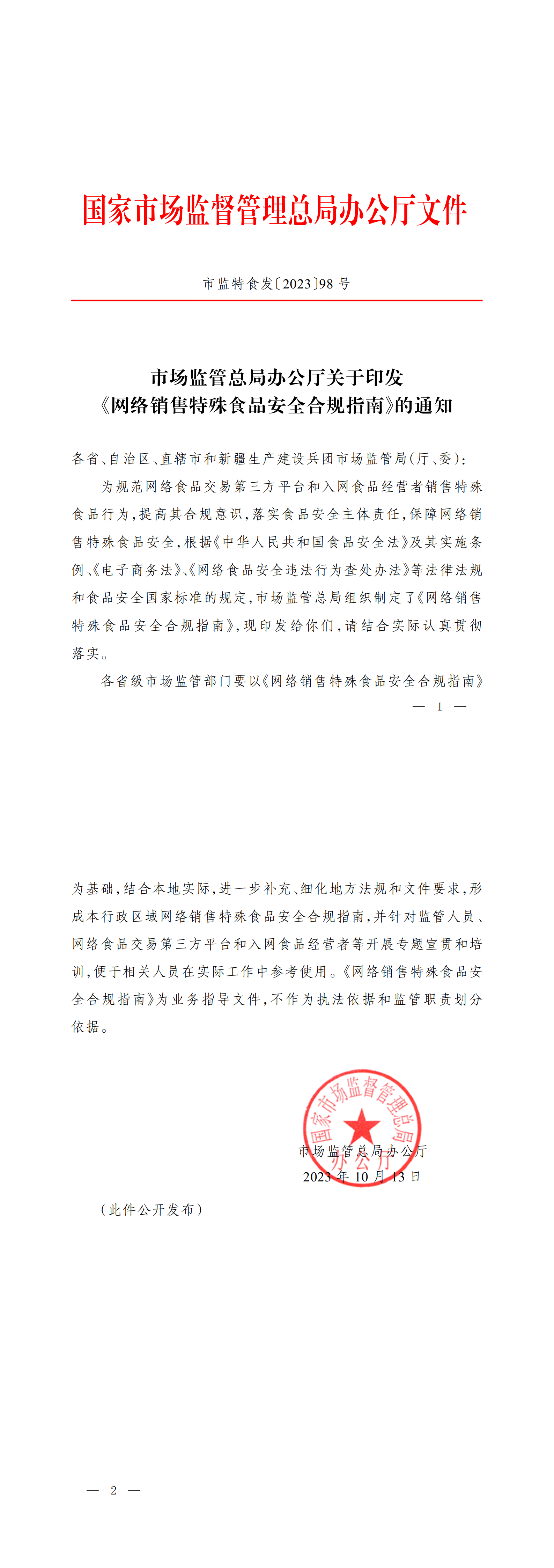 为规范网络食品交易第三方平台和入网食品经营者销售特殊食品行为,提高其合规意识,落实食品安全主体责任,保障网络销售特殊食品安全,根据《中华人民共和国食品安全法》及其实施条例、《电子商务法》、《网络食品安全违法行为查处办法》等法律法规和食品安全国家标准的规定,市场监管总局组织制定了《网络销售特殊食品安全合规指南》,现印发给你们,请结合实际认真贯彻落实。
