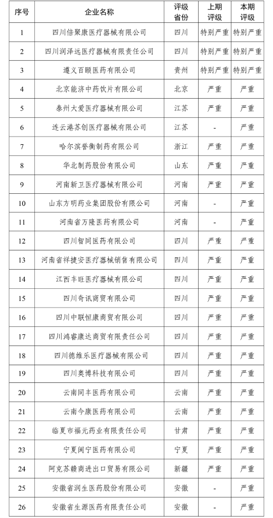 11月20日,国家医保局医药价格和招标采购指导中心发布了各省份评级为“特别严重”和“严重”失信的26家医药企业情况,其中23家医药企业评级为“严重”,3家医药企业评级为“特别严重”。