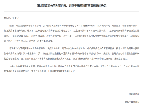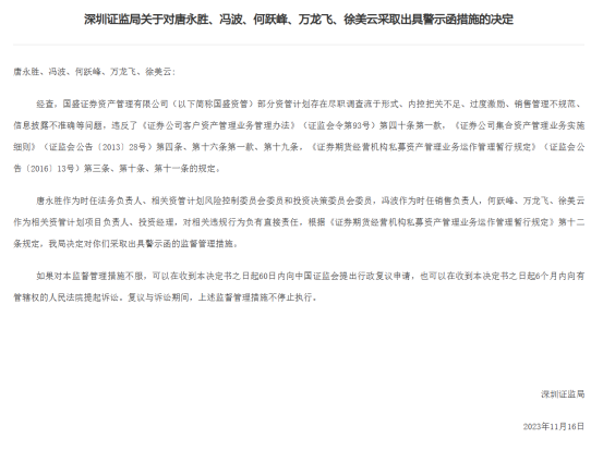 图为深圳证监局对国盛资管时任有关责任人出具罚单