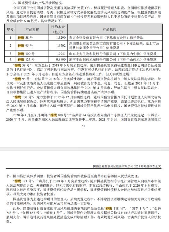 国盛金控在2023年半年报中表示,公司下属子公司国盛资管通过项目提前清理、分类、积极追讨等方式,妥善化解处理涉及风险或违约的产品,对于存在的4个对投资者利益影响较大的历史遗留的非标集合类产品已按照市场化法治化原则基本完成后续处置工作。