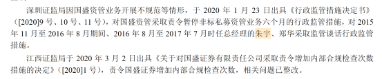 就在上述暂停业务的罚单出具两个月后,2020年3月2日,江西证监局又对国盛证券出具了《关于对国盛证券有限责任公司采取责令增加内部合规检查次数措施的决定》,责令国盛证券于年内增加覆盖资管子公司的内部合规检查次数。