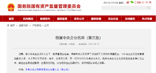 国务院国资委2021年和2022年已两次对“假央企”和“伪国企”进行集中公示,今年早些时候,国务院国资委公布第三批假冒“央企”295家名单,明确表示,假冒国企与中央企业无任何隶属或股权关系,也不存在任何投资、合作、业务等关系,其一切行为均与中央企业无关。请社会各界提高警惕,注意防范风险,如发现其违法犯罪行为,请尽快到公安机关报案。