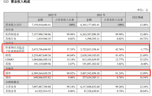 2022年报还显示,海普瑞的营业收入主要依赖国外市场,2021年和2022年国外营收占比均在90%以上,从产品来看,肝素钠以及低分子肝素钠原料药2022年营收占营收的比重为37.35%,制剂占44.84%,上述两类产品的毛利率分别为27.74%和35.32%。