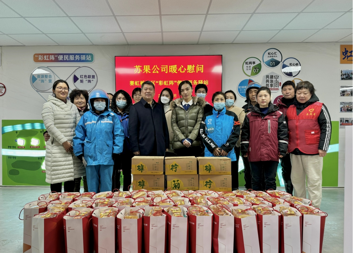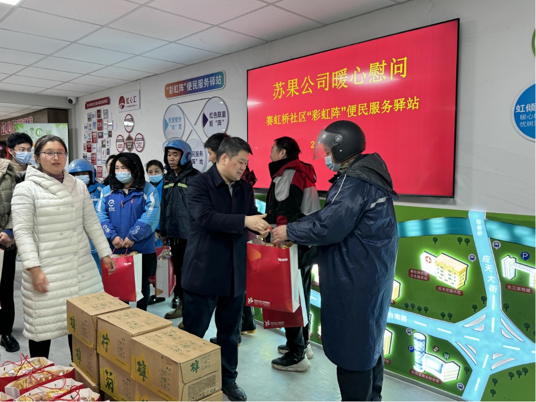 1月18日上午,寒风凛冽,苏果爱心志愿者团队来到南京市雨花台区赛虹桥社区“彩虹阵”便民服务驿站,为社区内的外卖员、快递员、环卫工人等冬季户外工作者送来保温桶、姜糖茶、面包、麦片、饮料等关爱物资,向他们表示关怀与敬意。“很感动,也很感谢来自苏果的关爱,天气虽冷,但是我们的心确是暖暖的。”苏果的善意之举,令户外工作者们感受到浓浓的暖意。