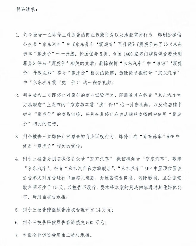 1月24日,上海阑途信息技术有限公司(途虎养车主体公司)已经向上海市闵行区人民法院提起诉讼,请求判令包含北京汽广行信息技术有限公司(京东养车主体公司)在内三被告赔偿500万。起诉缘由系此前京东养车曾推“震虎价”对原告商誉造成影响,途虎主张被告在全渠道删除“震虎价”相关表述。