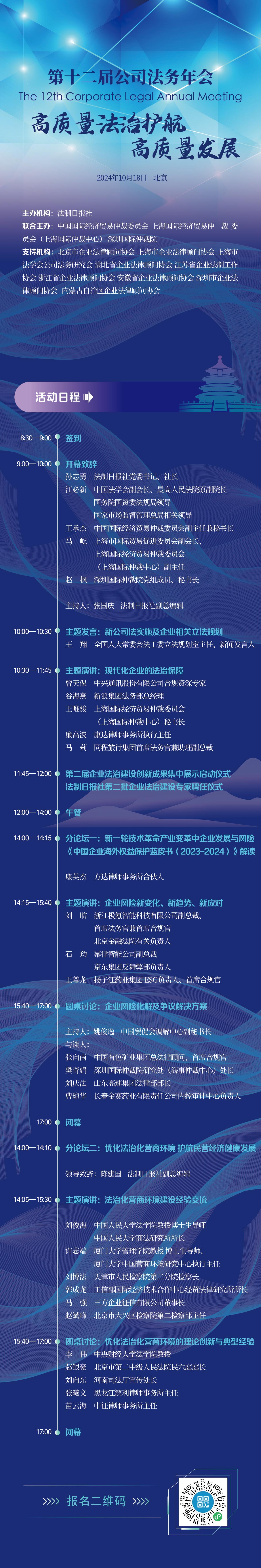 2024年是实现“十四五”规划目标任务的关键一年。面对新一轮科技革命和产业变革,企业在迎来发展新机遇的同时,也面临着数据安全治理、知识产权保护、反垄断、出口管制、经济制裁等诸多法律风险和挑战。为此,法制日报社将举办“第十二届公司法务年会(北京)”活动,旨在共同探寻企业在法治轨道上实现高质量发展的路径和策略,推动企业在以中国式现代化全面推进强国建设、民族复兴伟业中作出更大贡献。