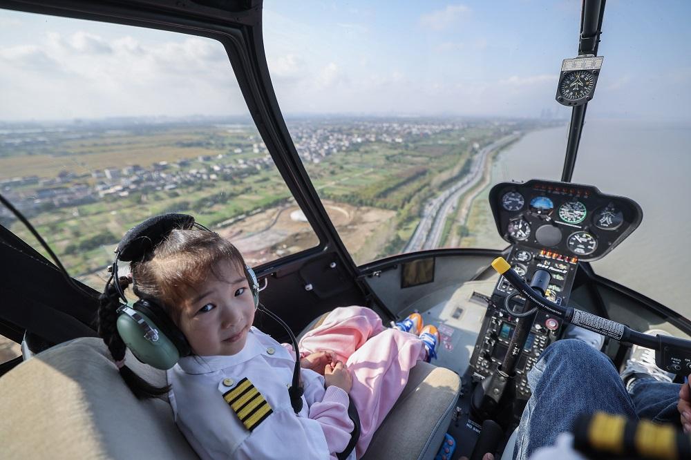 图为11月5日小游客乘坐米旗通航直升机飞行基地的直升机在空中饱览太湖南岸美景。湖州米旗通航服务有限公司是一家民营公司,专注于低空经济赛道的商业探索,在南太湖开启体验飞行、空中广告、空中拍摄和私用驾驶员执照培训等飞行项目。