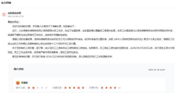 对此,名为“山东留言办理”的ID号12月8日在该条留言下回复称,齐河县人社局进行了调查处理:近日,山东莱钢永锋钢铁有限公司根据部分员工诉求,制定了安置政策,该安置政策以尊重员工意愿为前提,由员工自愿选择与公司协商解除劳动合同并领取经济补偿,或选择不解除劳动合同维持工作状态,该政策并非强制性政策。