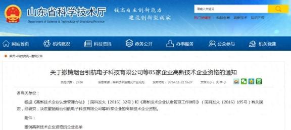 《通知》内容显示,根据《高新技术企业认定管理办法》(国科发火〔2016〕32号)和《高新技术企业认定管理工作指引》(国科发火〔2016〕195号)有关规定,经研究,决定撤销烟台引航电子科技有限公司等85家企业的高新技术企业资格。山东莱钢永锋钢铁有限公司则列于名单第78位,证书编号GR202237007406,撤销起始年份为2023年。