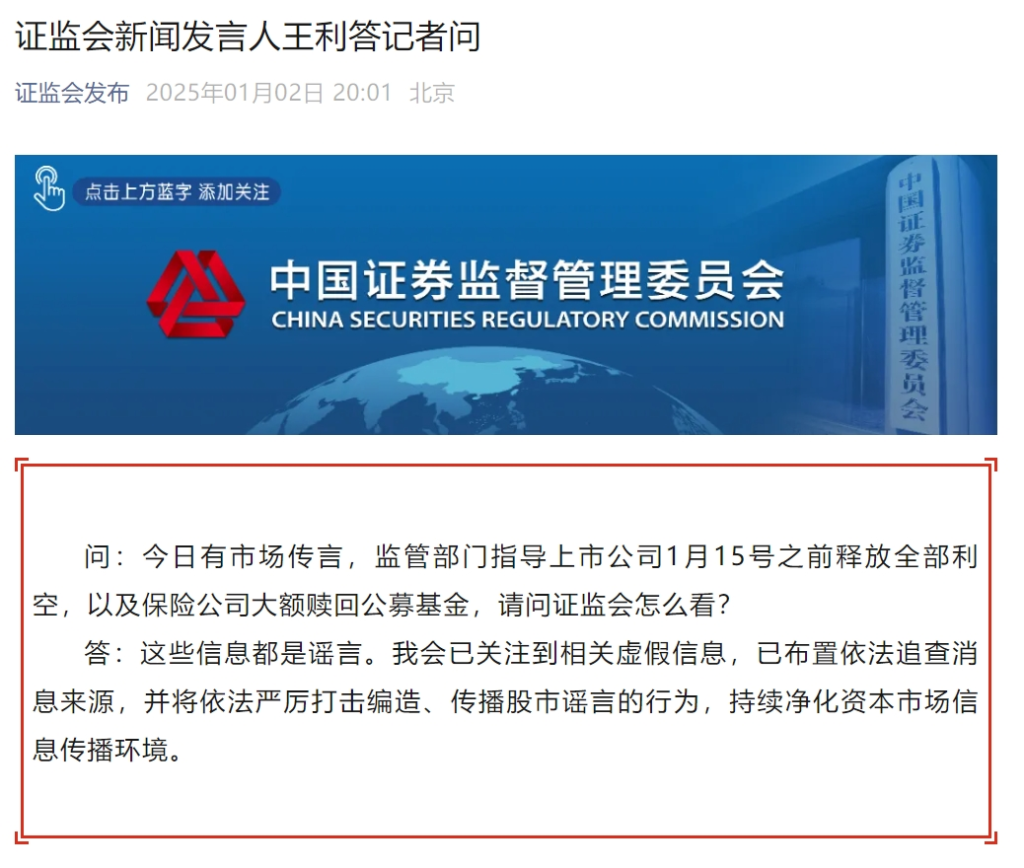 证监会新闻发言人王利1月2日回应“监管部门指导上市公司1月15号之前释放全部利空,以及保险公司大额赎回公募基金”的市场传言时说,这些信息都是谣言。证监会已关注到相关虚假信息,已布置依法追查消息来源,并将依法严厉打击编造、传播股市谣言的行为,持续净化资本市场信息传播环境。