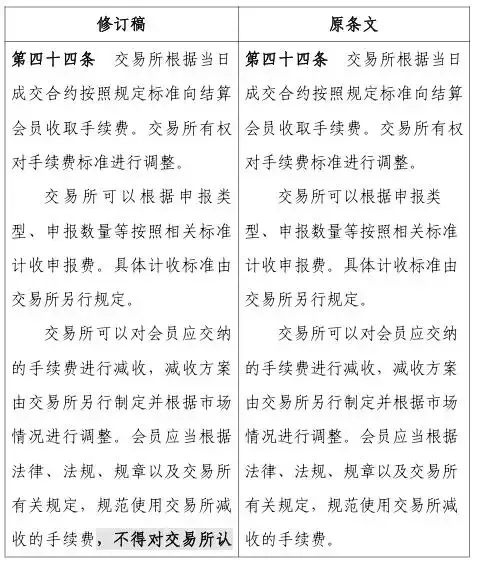 第四十四条规定,交易所可以对会员应交纳的手续费进行减收,减收方案由交易所另行制定并根据市场情况进行调整。会员应当根据法律、法规、规章以及交易所有关规定,规范使用交易所减收的手续费,不得对交易所认定的高频交易者进行手续费减收。其中,“不得对交易所认定的高频交易者进行手续费减收”为新增内容。