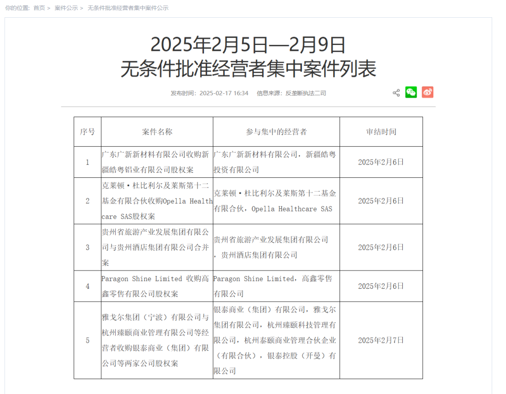 市场监督管理总局披露2025年2月5日—2月9日无条件批准经营者集中案件,其中雅戈尔集团(宁波)有限公司与杭州臻颐商业管理有限公司等经营者收购银泰商业(集团)有限公司等两家公司股权案获批。