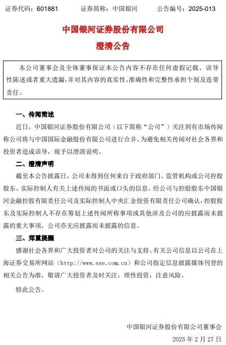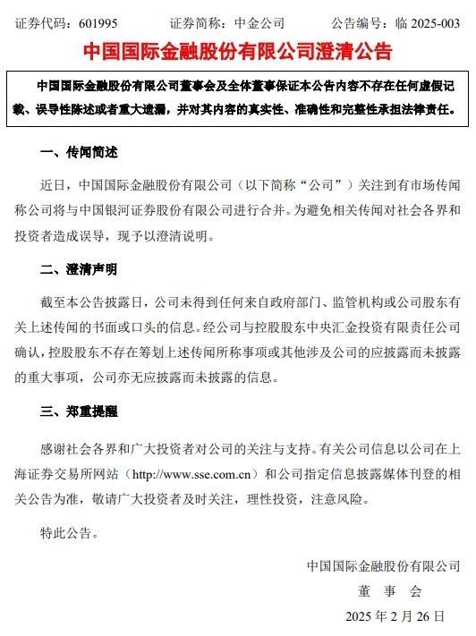 2月26日晚间,中金公司发布澄清公告称:“近日,公司关注到有市场传闻称公司将与中国银河进行合并。截至本公告披露日,公司未得到任何来自政府部门、监管机构或公司股东有关上述传闻的书面或口头的信息。”