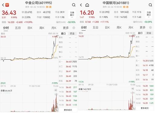 2月26日午后,中金公司和中国银河合并传闻再起,两家公司股价双双异动,其中两家公司A股股价均在半小时内快速涨停,中金公司A股收报36.43元/股,中国银河A股收报16.2元/股;港股方面,中金公司收报16.22港元/股,涨19.09%;中国银河收报8.76港元/股,涨17.11%。