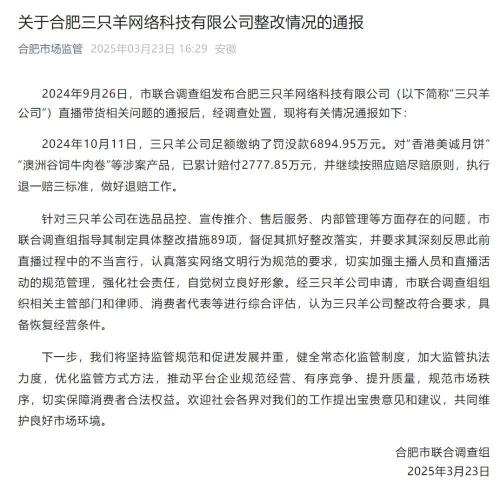 对于合肥三只羊网络科技有限公司(以下简称“三只羊公司”)直播带货相关问题,安徽省合肥市联合调查组23日发布通报称,2024年10月11日,三只羊公司足额缴纳了罚没款6894.95万元。对“香港美诚月饼”“澳洲谷饲牛肉卷”等涉案产品,已累计赔付2777.85万元,并继续按照应赔尽赔原则,执行退一赔三标准,做好退赔工作。针对三只羊公司在选品品控、宣传推介、售后服务、内部管理等方面存在的问题,合肥市联合调查组指导其制定具体整改措施89项。