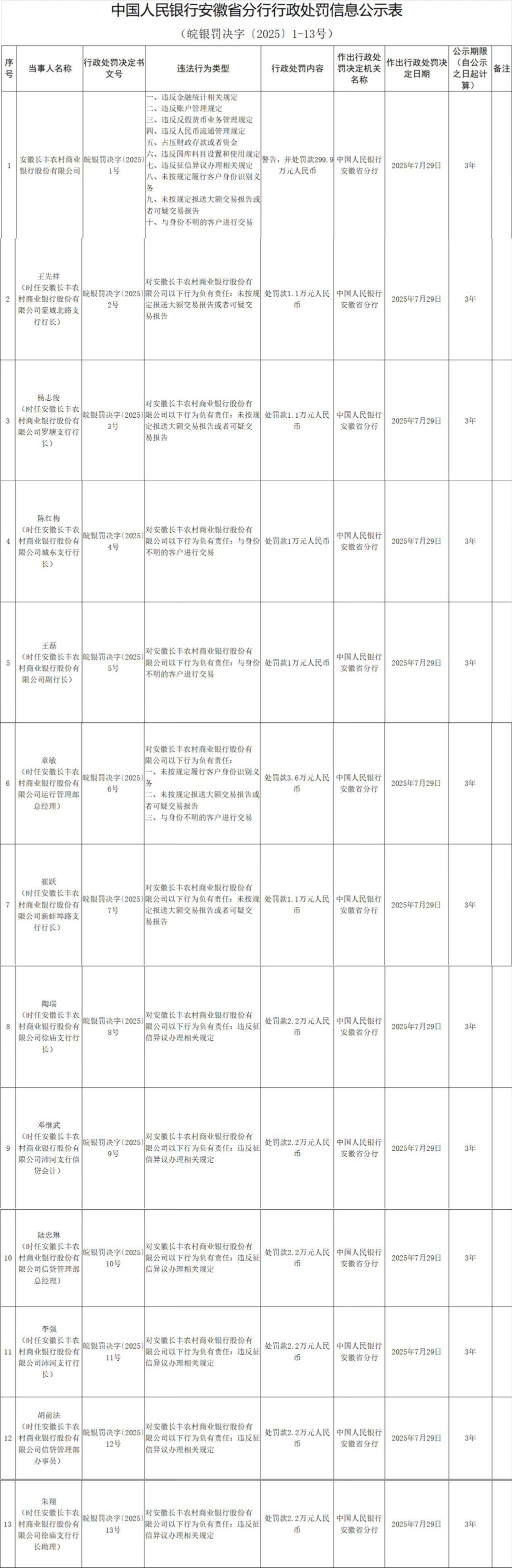具体看,时任长丰农商行蒙城北路支行行长王先祥、时任长丰农商行罗塘支行行长杨志俊、时任长丰农商行新蚌埠路支行行长崔跃被处罚款1.1万元,对长丰农商行未按规定报送大额交易报告或者可疑交易报告负有责任;