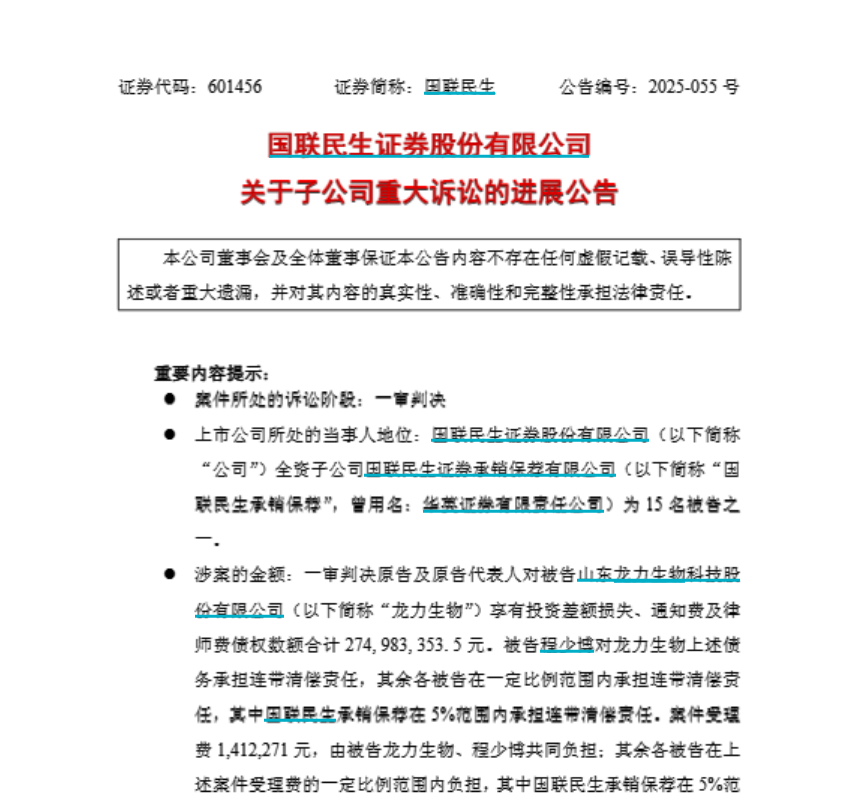 中介机构方面,国联民生证券承销保荐有限公司(简称“国联民生承销保荐”)在原告各项损失5%的范围内承担连带赔偿责任,立信会计师事务所(以下简称“立信所”)在原告各项损失30%的范围内承担连带赔偿责任。8月26日晚间,国联民生发布关于子公司重大诉讼的进展公告,公告了该事项。