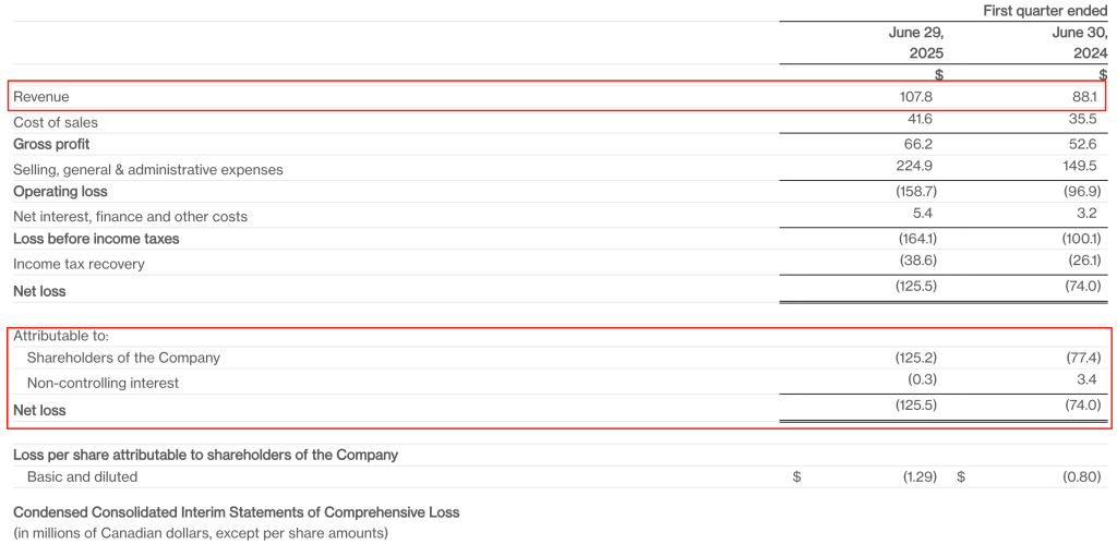 加拿大鹅是全球高性能奢华生活方式品牌,一家定位高端的羽绒服制造公司,创立于1957年。据加拿大鹅7月31日发布的截至2025年6月29日的2026财年第一财季财务业绩显示,第一财季实现营收1.078亿美元,同比增长22.4%,按固定汇率计算增长21.5%;归母净亏损为-1.252亿美元,去年同期为-0.774亿美元,亏损同比扩大超六成。
