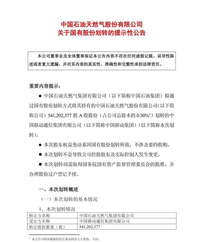 公告显示,本次划转前,中国石油集团直接持有公司150,923,565,570股A股股份,占公司总股本的82.46%,通过境外全资附属公司Fairy King InvestmentsLtd.间接持有公司291,518,000股H股股份,占公司总股本的0.16%。中国移动集团通过附属公司中国移动通信有限公司持有公司178,794,300股,占公司总股本的0.10%。