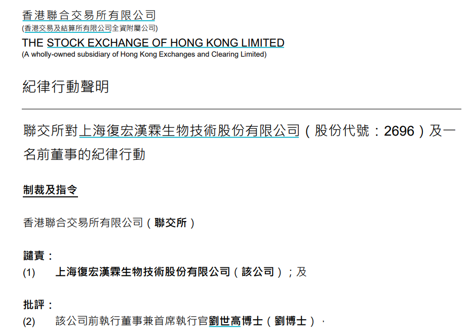 9月2日,复宏汉霖(2696.HK)公告了一份联交所对公司及一名前董事的纪律行动声明。文件显示,复宏汉霖受到港交所谴责,而公司前执行董事兼CEO刘世高受到批评。港交所要求刘世高接受26小时有关监管和法律议题以及上市规则合规事宜的培训,才能再获委任为任何已于或将于联交所上市的公司董事。