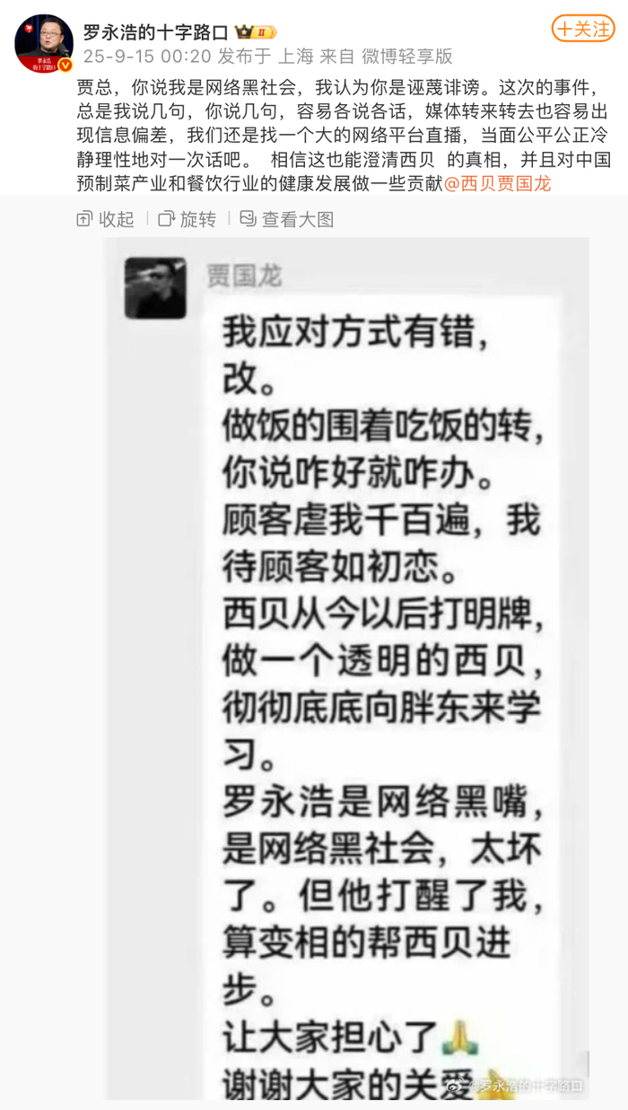 近日,西贝餐饮与罗永浩就预制菜引发的争论在网络上持续发酵。14日晚间,西贝创始人贾国龙此前表态的完整截图流出,其中除了提到西贝从今以后要打明牌、向胖东来学习外,还将罗永浩称为网络黑嘴、网络黑社会。对此,罗永浩今日凌晨在社交平台表示,本次事件中双方总是各说各话,媒体转来转去也容易出现信息偏差。他提议,双方找一个大型网络平台直播,当面对话。