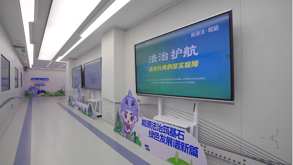 该基地占地约400平方米,配备数字互动终端、智慧调控系统、成果展示台等设施。其展厅设计以“法治冀北·绿色希冀——能源法治守护绿水青山”为核心主题,设置序厅、“能源法·起航”、“能源法·践行”、“能源法·未来”四大展区,通过“图片+视频+讲解”三位一体的展示方式,系统呈现能源法的立法背景、核心制度及重要意义。