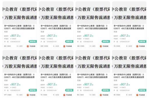阿里资产司法平台显示,上述4800万股股份被分为10个标的,每一个标的物“李**持有的中公教育(股票代码:002607)480万股无限售流通股股票”的起拍价为907.2万元。