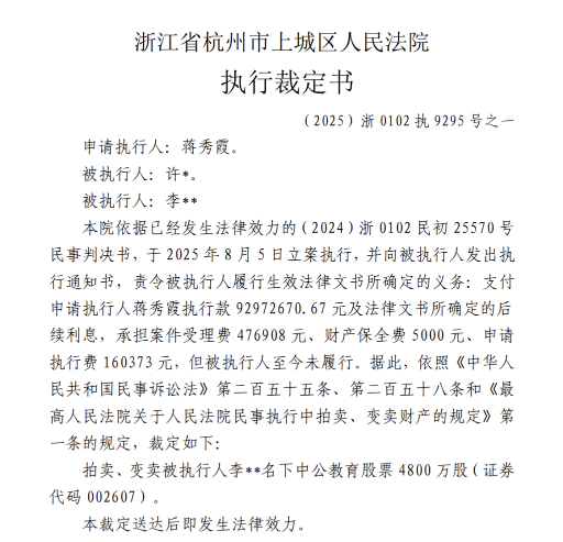 根据司法拍卖平台披露的浙江省杭州市上城区人民法院执行裁定书,法院依据已经发生法律效力的(2024)浙0102民初25570号民事判决书,于2025年8月5日立案执行,并向被执行人发出执行通知书,责令被执行人履行生效法律文书所确定的义务:支付申请执行人蒋秀霞执行款92972670.67元及法律文书所确定的后续利息,承担案件受理费476908元、财产保全费5000元、申请执行费160373元,但被执行人至今未履行。据此,依照《中华人民共和国民事诉讼法》第二百五十五条、第二百五十八条和《最高人民法院关于人民法院民事执行中拍卖、变卖财产的规定》第一条的规定,裁定拍卖、变卖被执行人名下中公教育股票4800万股(证券代码002607)。