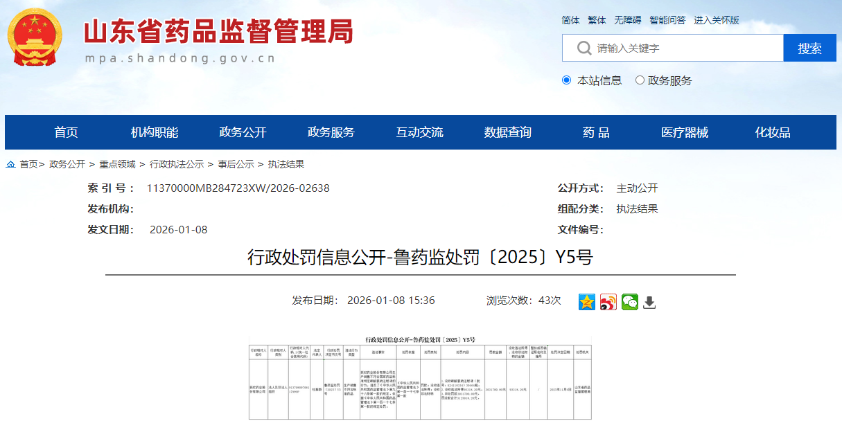 1月8日,山东省药品监督管理局官网发布的处罚信息显示,辰欣药业股份有限公司(下称辰欣药业)因生产销售不符合标准药品,被罚没312.5万元。