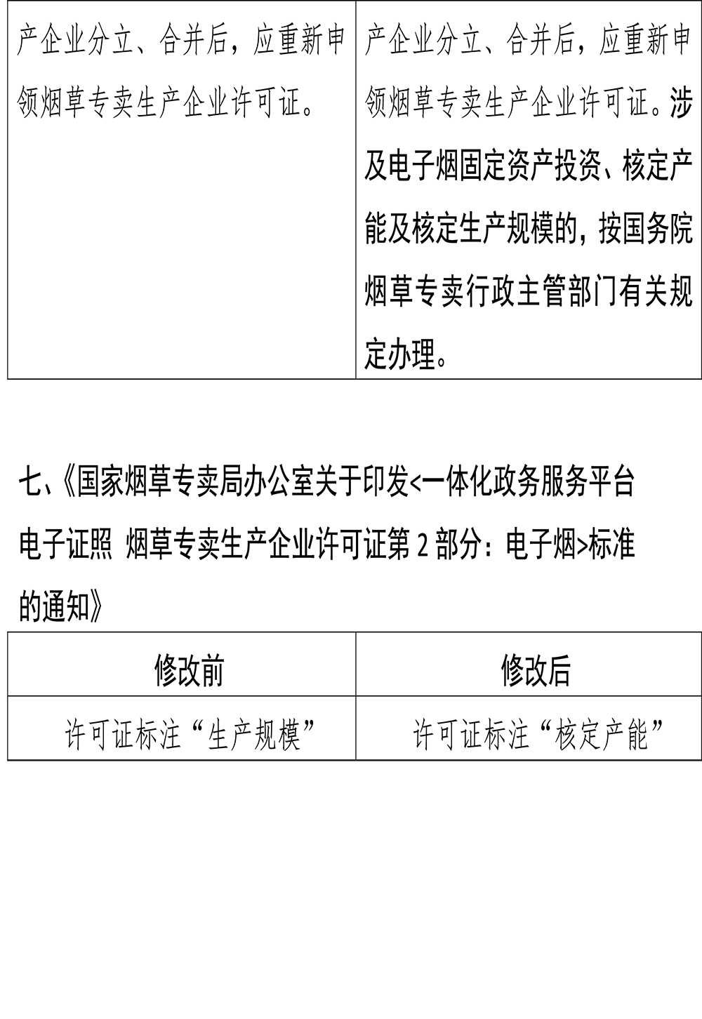 此外,《电子烟相关生产企业设立、分立、合并、撤销管理细则》第二十二条,新增“电子烟相关生产企业分立、合并后,涉及电子烟固定资产投资、核定产能及核定生产规模的,按国务院烟草专卖行政主管部门有关规定办理”。《国家烟草专卖局办公室关于印发<一体化政务服务平台 电子证照 烟草专卖生产企业许可证第2部分:电子烟>标准的通知》则是要求将许可证标注“生产规模”修改为标注“核定产能”。