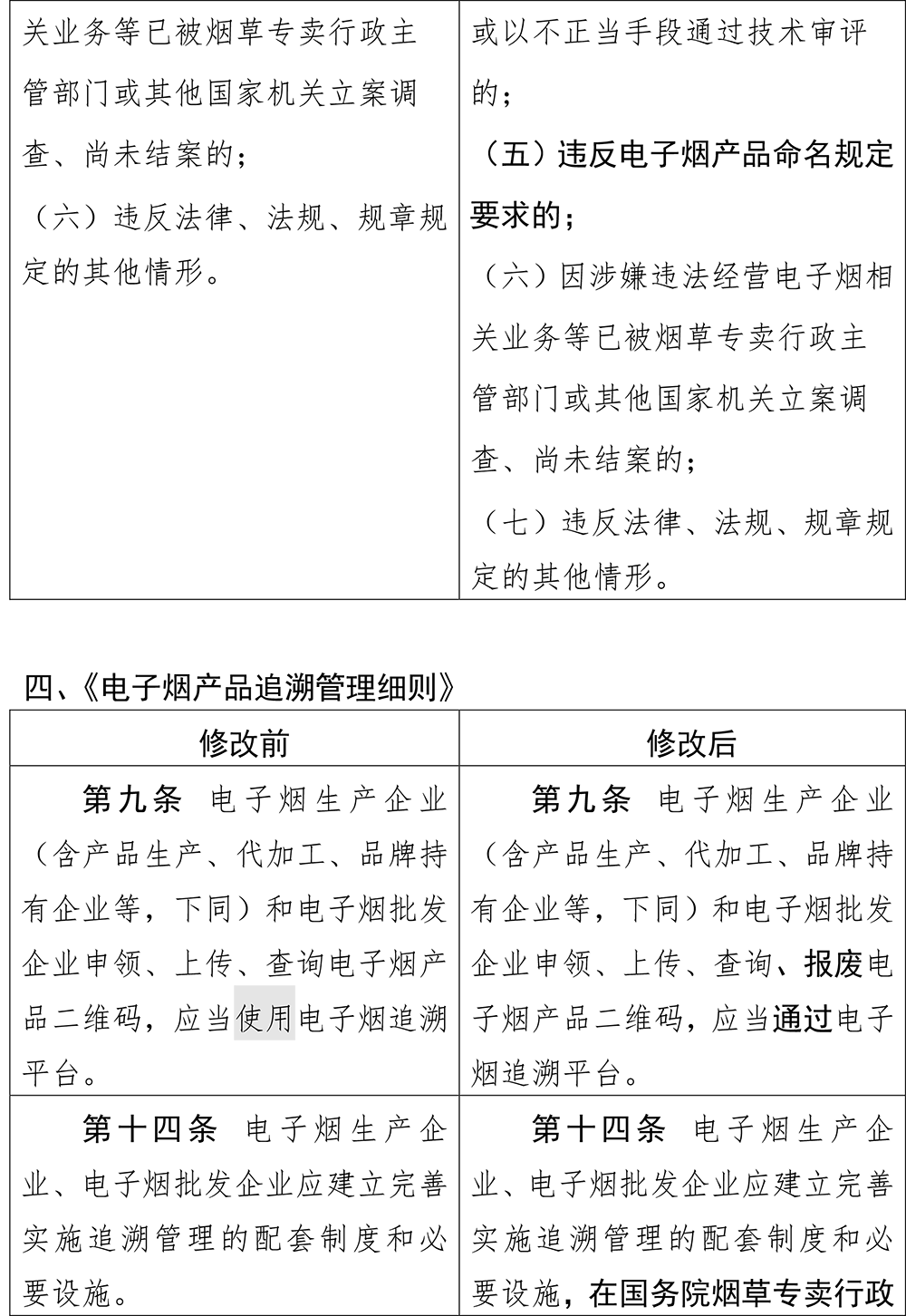 《电子烟产品追溯管理细则》共修改了五处,其中,第九条原为“电子烟生产企业(含产品生产、代加工、品牌持有企业等,下同)和电子烟批发企业申领、上传、查询电子烟产品二维码,应当使用电子烟追溯平台”,修改后则要求是“应当通过电子烟追溯平台” 。