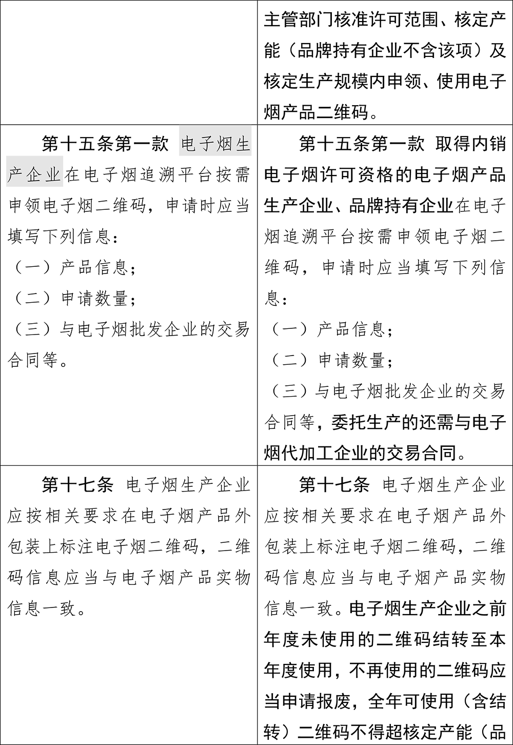 第十四条修改为“电子烟生产企业、电子烟批发企业应建立完善实施追溯管理的配套制度和必要设施,在国务院烟草专卖行政主管部门核准许可范围、核定产能(品牌持有企业不含该项)及核定生产规模内申领、使用电子烟产品二维码”,而在此前,第十四条只是要求“电子烟生产企业、电子烟批发企业应建立完善实施追溯管理的配套制度和必要设施”,并无更细化的要求。
