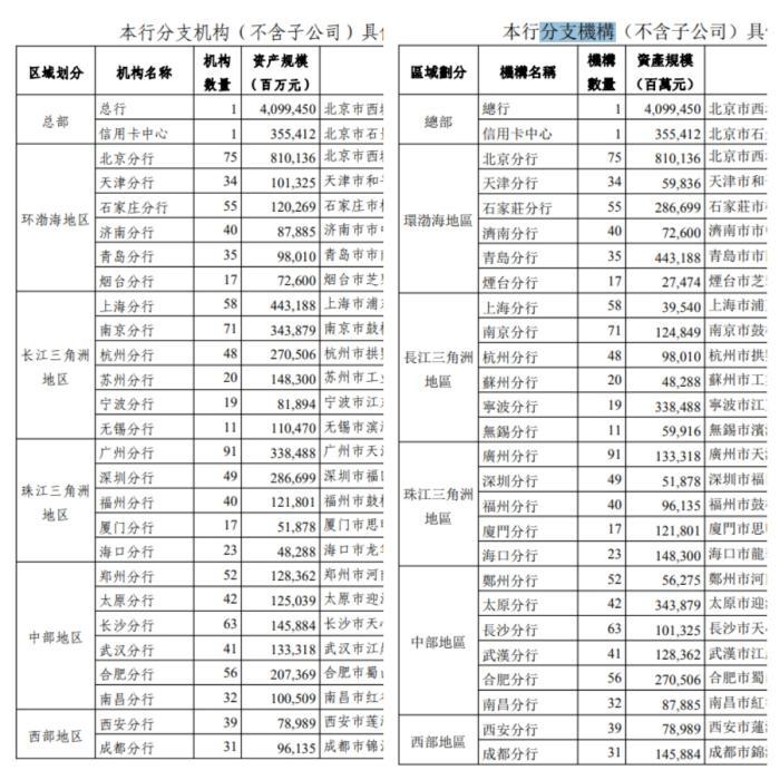 中新网记者对比两份公告发现,除北京分行、西安分行、悉尼分行、澳门分行等少数分支机构数据一致外,40家分支机构的资产规模出现较大出入。