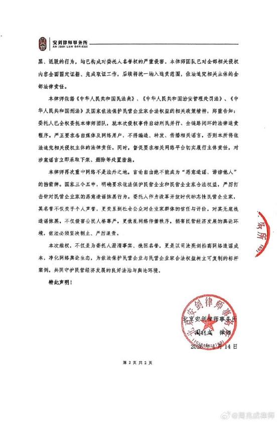 4月14日,北京安剑律师事务所发布律师声明称,受万科集团创始人、名誉主席王石独家全权委托,就近期网络上针对委托人的恶意造谣、诽谤等侵权行为,发布律师声明,澄清事实、以正视听、严正追责。