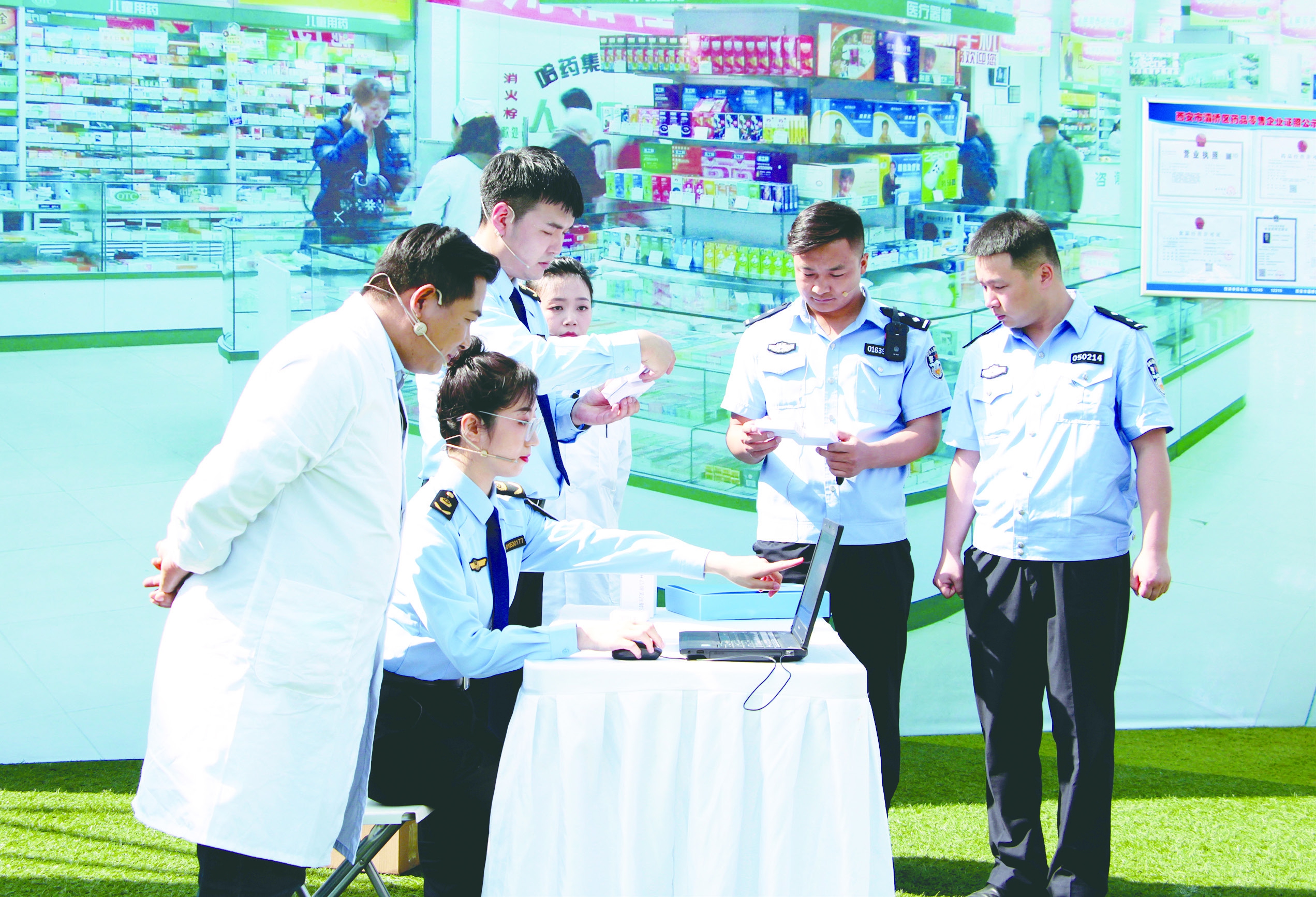 图为在演练现场灞桥区市场监管局联合西安市公安局灞桥分局模拟对涉事药品企业展开调查。贺一辰 摄